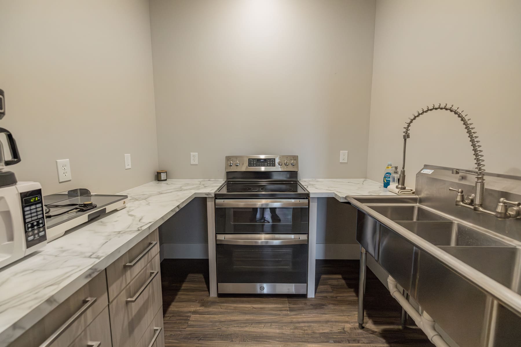 - Includes access to small indoor kitchen (oven/cooktop, three-compartment sink, microwave, full-size fridge, and small freezer)